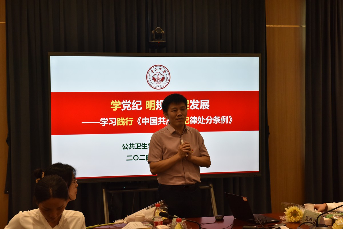 在党纪学习教育专题会环节,教师党支部书记、系主任黄奕祥教授结合本系教师的工作性质和毕业研究生的就业岗位,以《学党纪、明规范、促发展》为题给老师和同学们讲了一堂生动的党纪教育专题党课。接着,研究生党支部李雪竹同志以《严党纪、守信念》为题的党课中,结合现实的案例,讲明党员严党纪、守信念的重要性。环节最后,全体党员在领誓人李雪竹同志的带领下,面向党旗,高举右拳,重温入党誓词,声声誓言,铿锵有力,强烈震撼着在场的每一位党员,使党员追忆入党初心,牢记“第一身份”,展现出为祖国公共卫生事业担当作为的初心和理想。