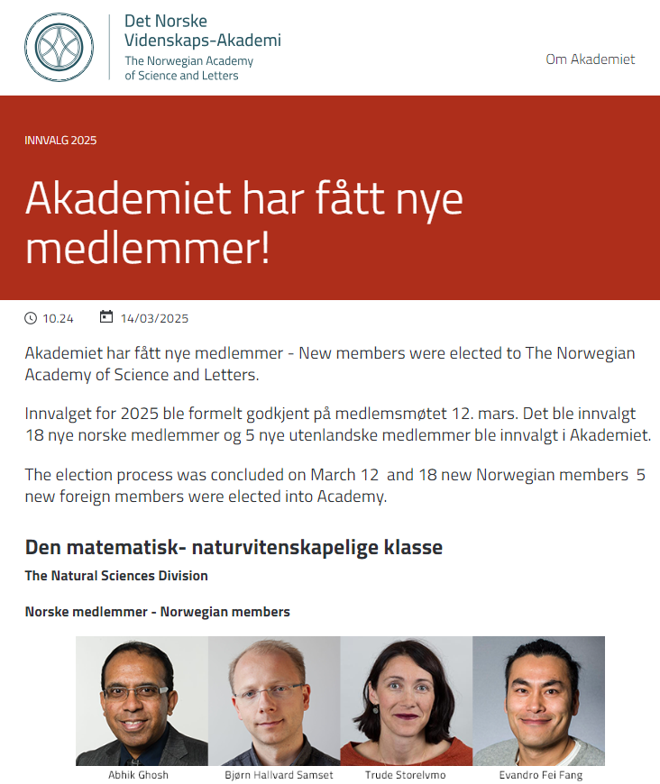 2025年3月12日,挪威科学与文学院(The Norwegian Academy of Science and Letters)公布了2025年新当选的院士名单。DB彩票 2008届卫生毒理学专业硕士研究生校友、挪威奥斯陆大学和阿克斯胡斯大学医院方飞(Evandro Fei Fang-Stavem)教授荣膺院士,成为该院年度新增院士之一。