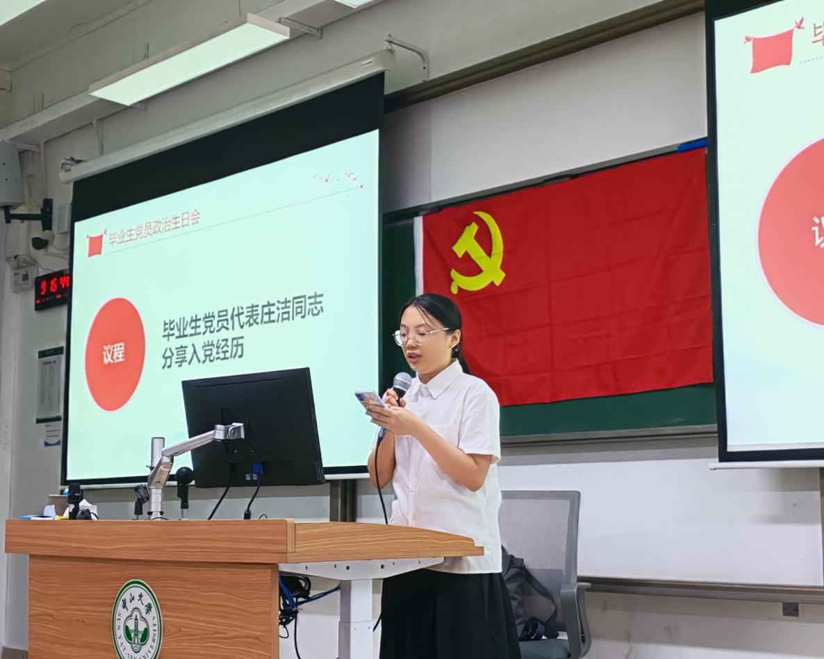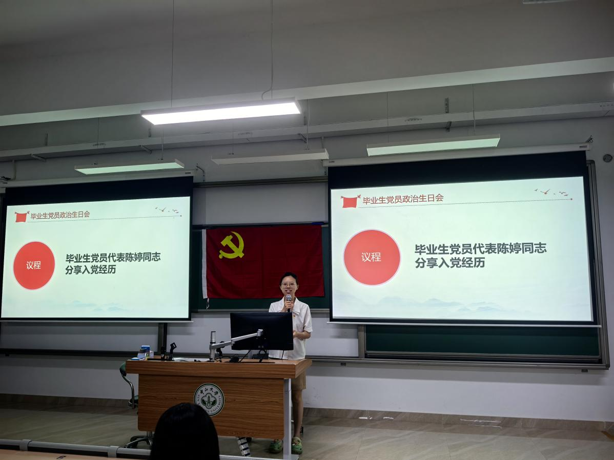 活动伊始,支部书记蓝丹红老师带领大家回顾了同学们在党支部参加的各项活动,从主题教育学习到系列志愿服务,内容精彩纷呈,也勾起了大家满满的回忆。随后,两位毕业生党员代表轮流上台,分享了自己的入党经历和心路历程。陈婷同志深情回顾了自己的入党历程,她提到“党员生涯使我在思想和行动上都得到了深刻的洗礼和升华”,无数次的志愿实践活动和主题教育培训,让她意识到党员的责任不仅在于口号,更在于点滴行动中。庄洁同志回忆起自己大一时提交入党申请书的激动与自豪,以及加入党组织后的成长历程。她坦言,抗疫时期的党支部志愿活动,让她感受到党员精神的精髓在于一呼即应、力往一处使的凝聚力。她还号召其他党员同志,不止要将实际行动局限与学校内,而是走出去服务更多群众。