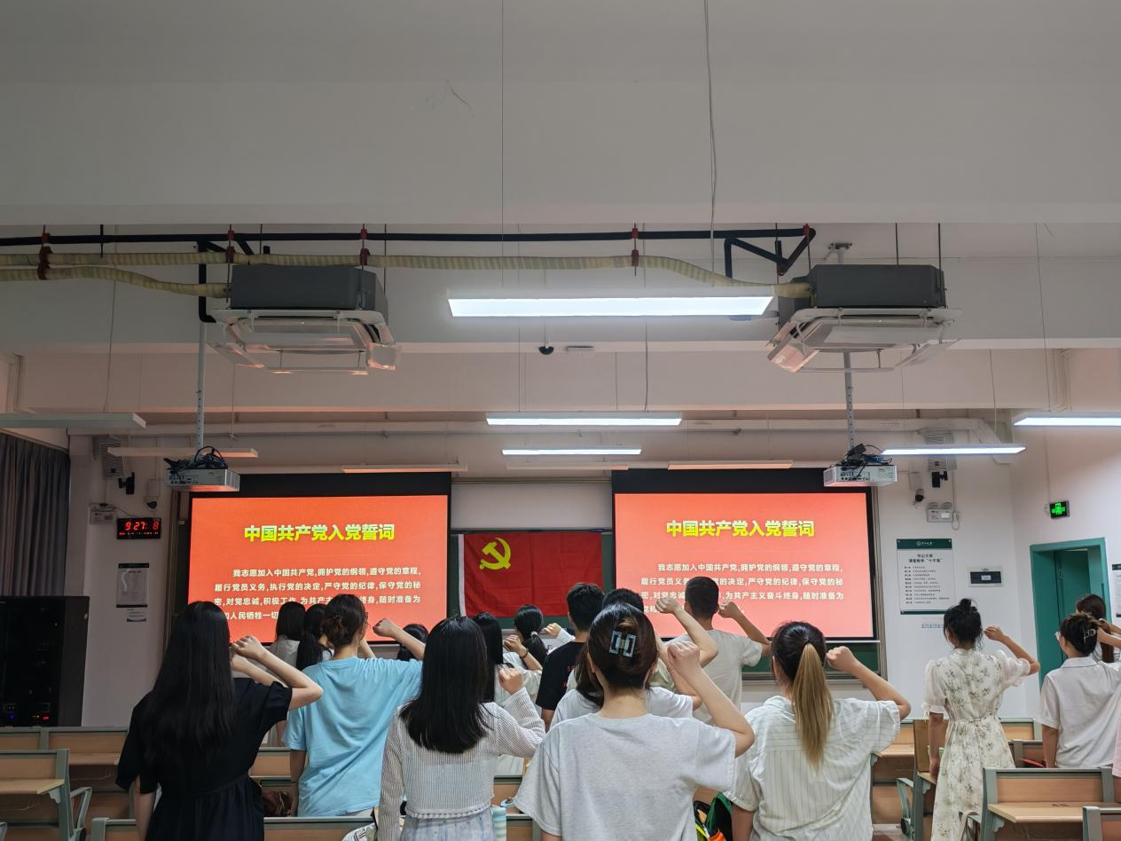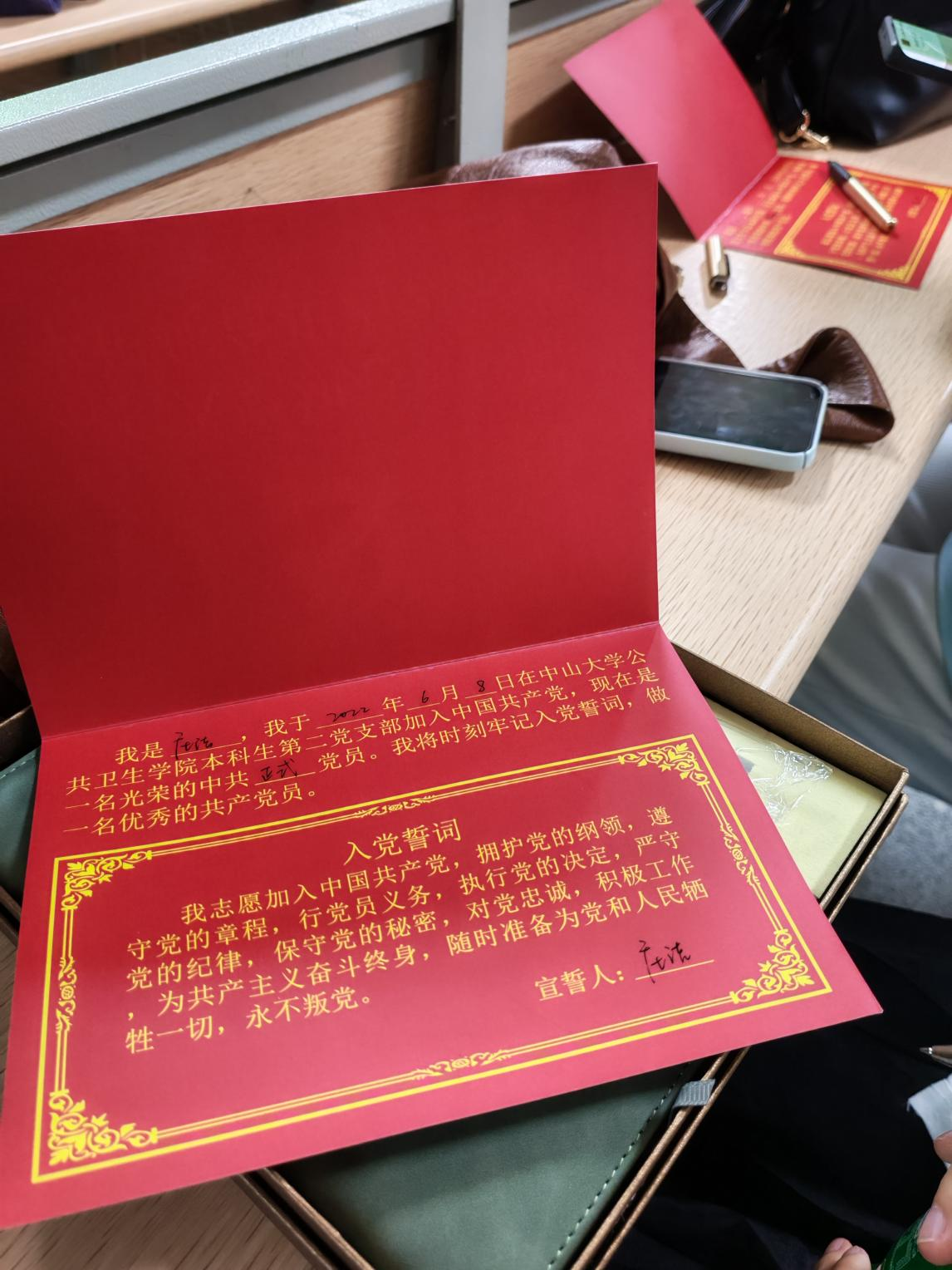 活动的第三部分,支部书记蓝丹红老师向毕业生党员赠送五个一“政治生日”礼物:一枚党员徽章、一本党章、一张含入党宣誓词的贺卡、一本党员学习笔记本和一支笔,勉励大家牢记党员身份,永葆共产党员的先进性和纯洁性,要持续加强学习,提升自我。随后,在老师的带领下,全体毕业生党员重温入党誓词。铿锵有力的誓言在会场回荡,激励着每一位党员不忘初心、牢记使命。