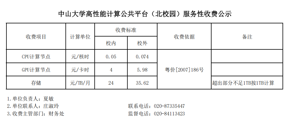 高性能计算公共平台(北校园)服务性收费标准进行公示。