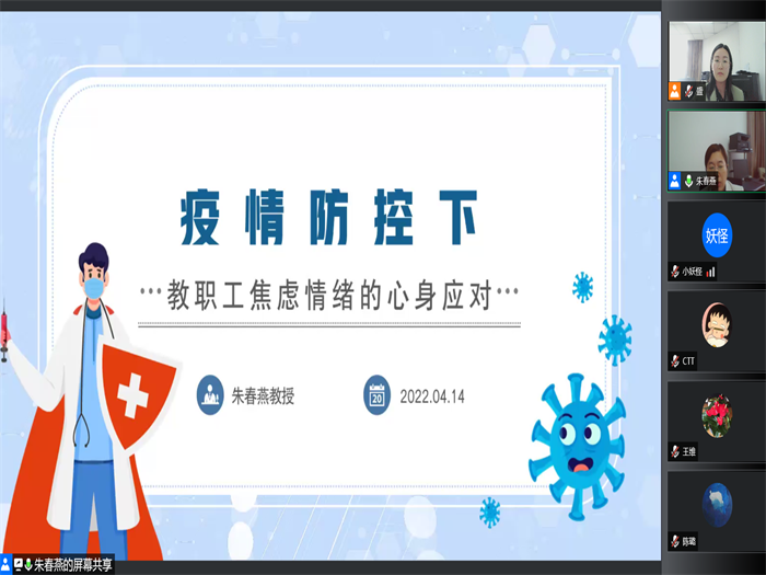 4月14日,校教职工心理健康服务中心邀请DB彩票 副院长朱春燕教授,以“疫情时期的焦虑情绪应对”为主题,为全校职工开展了一场线上公益讲座,提醒广大教职工做好“心理防疫”。全校500余名教职工线上参加活动。