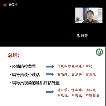 讲座首先提出了疫情防控背景下辅导员工作的矛盾与变化,呼吁辅导员群体从大环境把握学生的心理状态。陆菁结合自己10余年的辅导员工作经历,总结凝练出辅导员应从谈话规模、谈话形式和谈话内容等多个方面学会如何与学生进行谈话,做到分类指导,各有侧重;最后,讲座介绍了辅导员视角下的心理危机评估处置,从专业角度向辅导员提出要学会讲科学、懂法律、团队战;对待学生,要做到不歧视、不漠视、不贴标签。