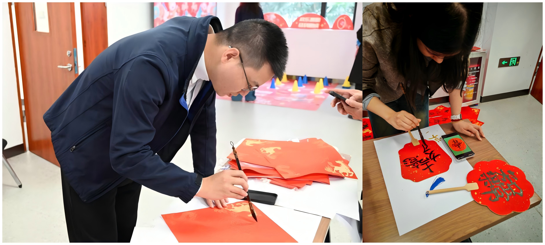红纸铺展,墨香四溢,写对联、团扇DIY环节成为活动中一抹雅致的亮色。学院邀请了有书法特长的领导与老师,与留校学子一同执笔挥毫,将新春的美好期许凝于笔尖。一张张福字、一副副对联、一柄柄团扇,既是手作的心意,更是新春的祝福,学子们或互赠作品,或悉心珍藏,让温暖在指尖传递。