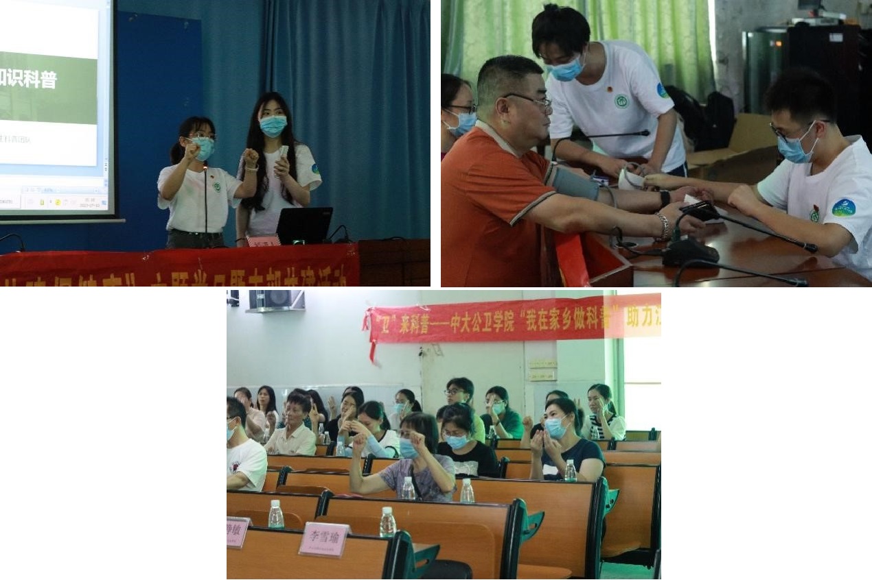 7月10日下午,队员们在社区卫生服务中心开展慢性病防控宣讲。不仅通过幻灯片清晰展示了糖尿病、冠心病、高血压、脑卒中这四类常见慢性病的相关知识和预防措施,亦带领听众一起做手指操、设置义诊以及与宣讲知识相关的游戏环节,群众学习热情高涨。