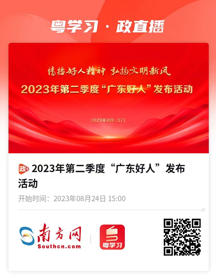 8月24日下午3时,2023年第二季度“广东好人”发布活动在江门演艺中心侨都大剧院举行。本次活动由广东省精神文明建设委员会办公室主办,南方新闻网、江门市委宣传部、江门市文明办承办,在广东文明网、南方网、粤学习客户端、南方+客户端多个平台全程直播。