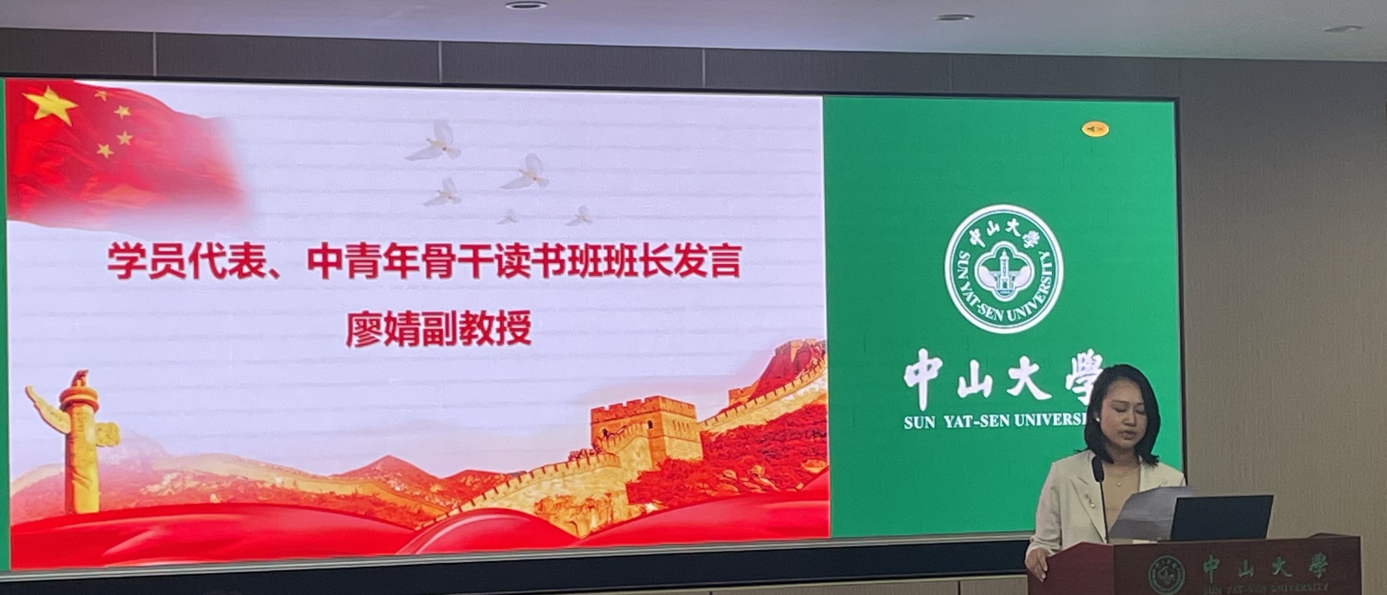 学院夏敏院长代表学院给第三期中青年教师骨干读书班授班旗。读书班班长廖婧副教授接旗。