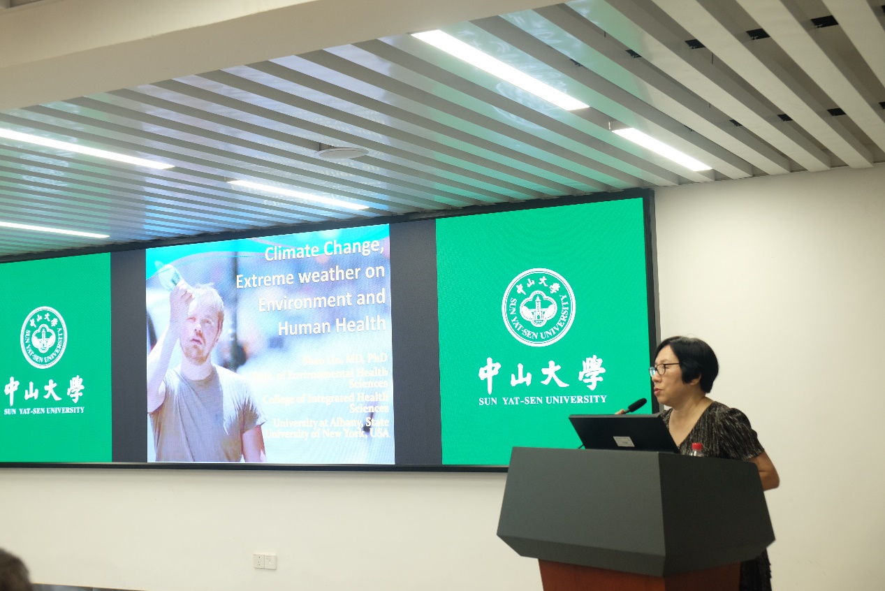 副院长董光辉、教师代表及学生代表参加了讲座。林梢教授以美国纽约州为例,指出近二十年来,气候恶化和极端天气对环境及人体健康带来了多方面的不良影响,包括气温升高、供电紧张以及断电、山火频发、呼吸道和心脏性疾病等因素引起公众死亡率升高,对于气候、环境与健康这一全球议题为观众带来了全方位多角度的思考与理解。