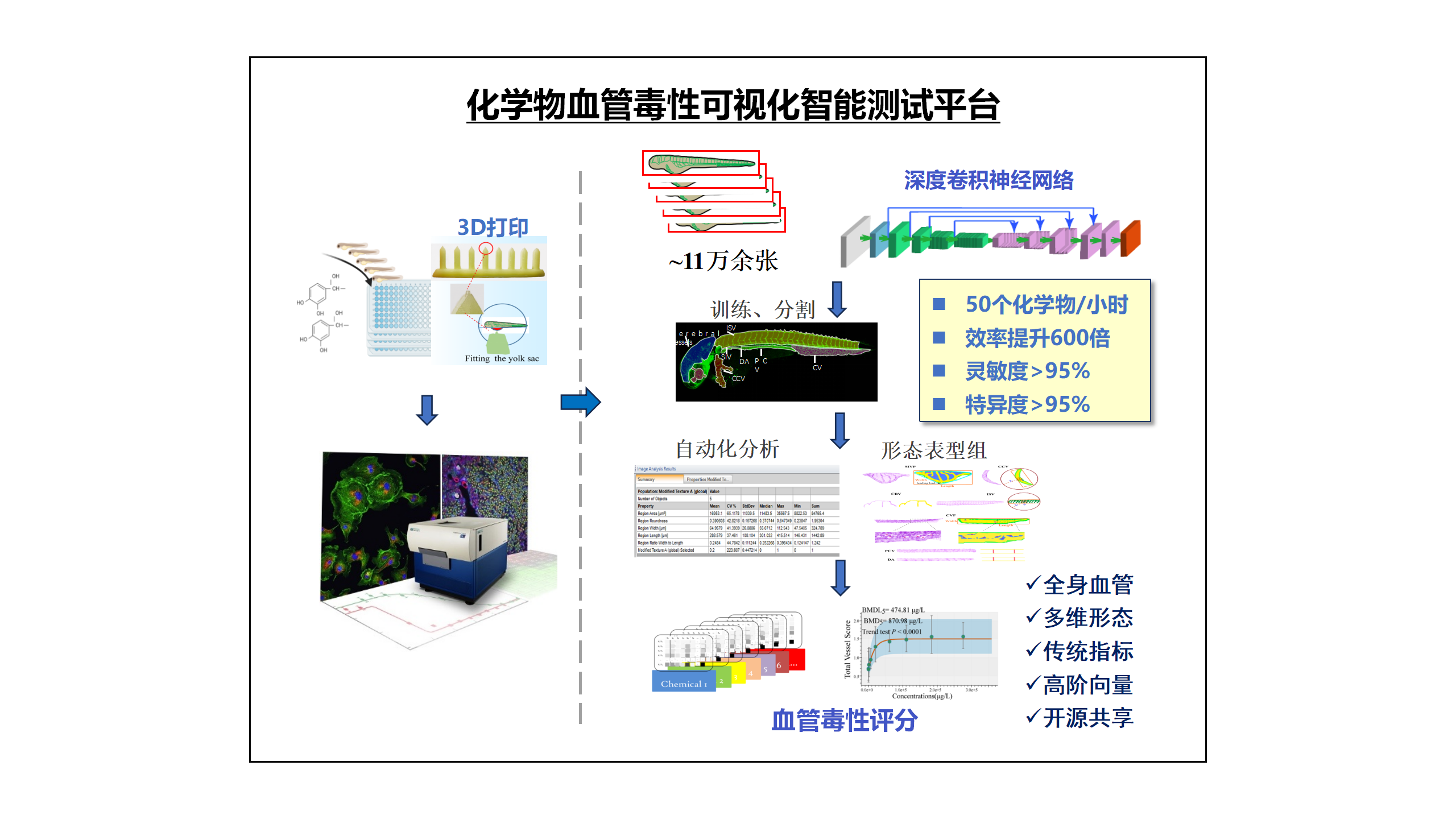 随着工业化进程的加速推进,环境污染物对心血管系统的危害日益凸显。传统血管毒性评估方法普遍存在效率低下、参数有限、通量受限等技术局限。针对这些问题,韦艳宏教授团队提出融合人工智能与形态组学研究策略,集成高内涵成像和计算机视觉技术构建高通量自动化测试框架,开发了基于深度学习的血管智能识别算法,建立包含全身血管31项形态学参数的评估指标体系,实现从图像采集到毒性评估的全流程自动化,包括图像采集标准化处理、血管网络自动识别、多参数同步测量、多指标整合量化评分、血管表型与疾病关联分析等毒性评价关键环节,率先构建基于多维表型靶点的化学物血管毒性可视化智能测试平台。该平台可完成每小时检测约50个化学物,效率提升600倍,同时克服了体外筛选图像信息有限、效能低下的瓶颈问题,是化学物心血管毒性测试技术变革的成功范例。目前该方法已成功应用于全氟/多氟烷基化合物、农药、阻燃剂、塑化剂、药物、空气颗粒物等十大类人群高暴露污染物血管毒性测试。该技术将为环境健康风险评估提供更加高效、可靠的技术支持,具有广阔的应用前景。