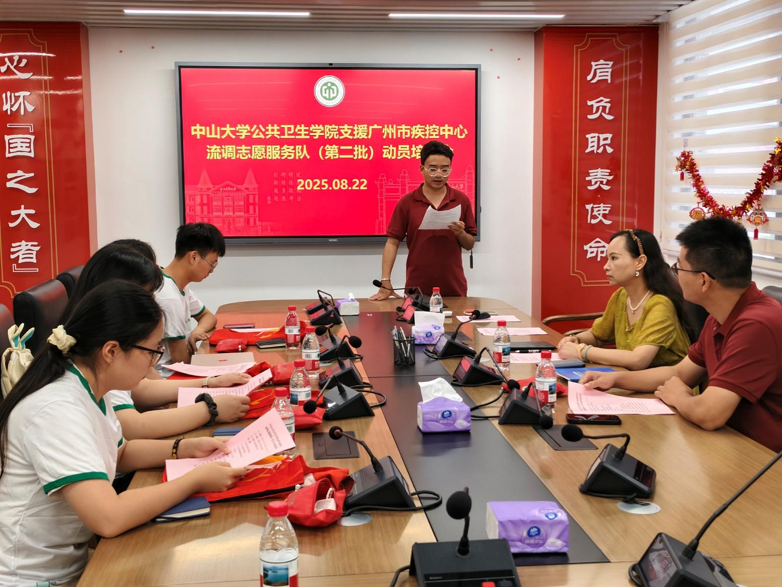 第二批志愿者接力出征!2025年8月22日上午,学院在北校园19号楼一楼党员活动室召开第二批支援广州市疾控中心流调志愿服务队动员培训会。学院党委副书记王燕芳、团委副书记杜志成副教授、党政专职辅导员李永强及第二批全体志愿者参会。会议由李永强老师主持。会议同样围绕支援广州市疾控中心开展基孔肯雅热疾病防控流调志愿服务工作展开,旨在统筹部署志愿服务任务,强化专业技能培训,凝聚师生抗疫合力。