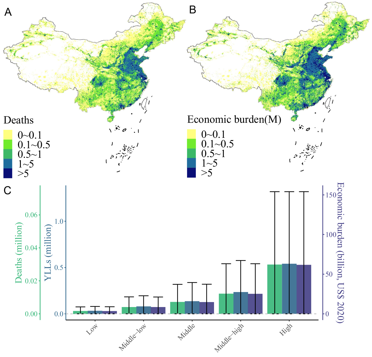基于课题组前期积累的绿地-健康证据分级和关键效应参数(已发表于The Innovation及eBioMedicine等期刊),研究团队进首先核算了中国通过增加绿地水平可避免的疾病和经济负担,发现我国若将平均绿地覆盖比例提升至25%,可避免5万人死亡,对应经济收益113.73亿美元;尤其城市区域、东部地区及高GDP地区获益更高(图1)。该成果发表于城市规划领域顶级期刊Landscapes and Urban Planning(IF=9.2),博士研究生邱慧玲为第一作者,杨博逸教授为通讯作者。