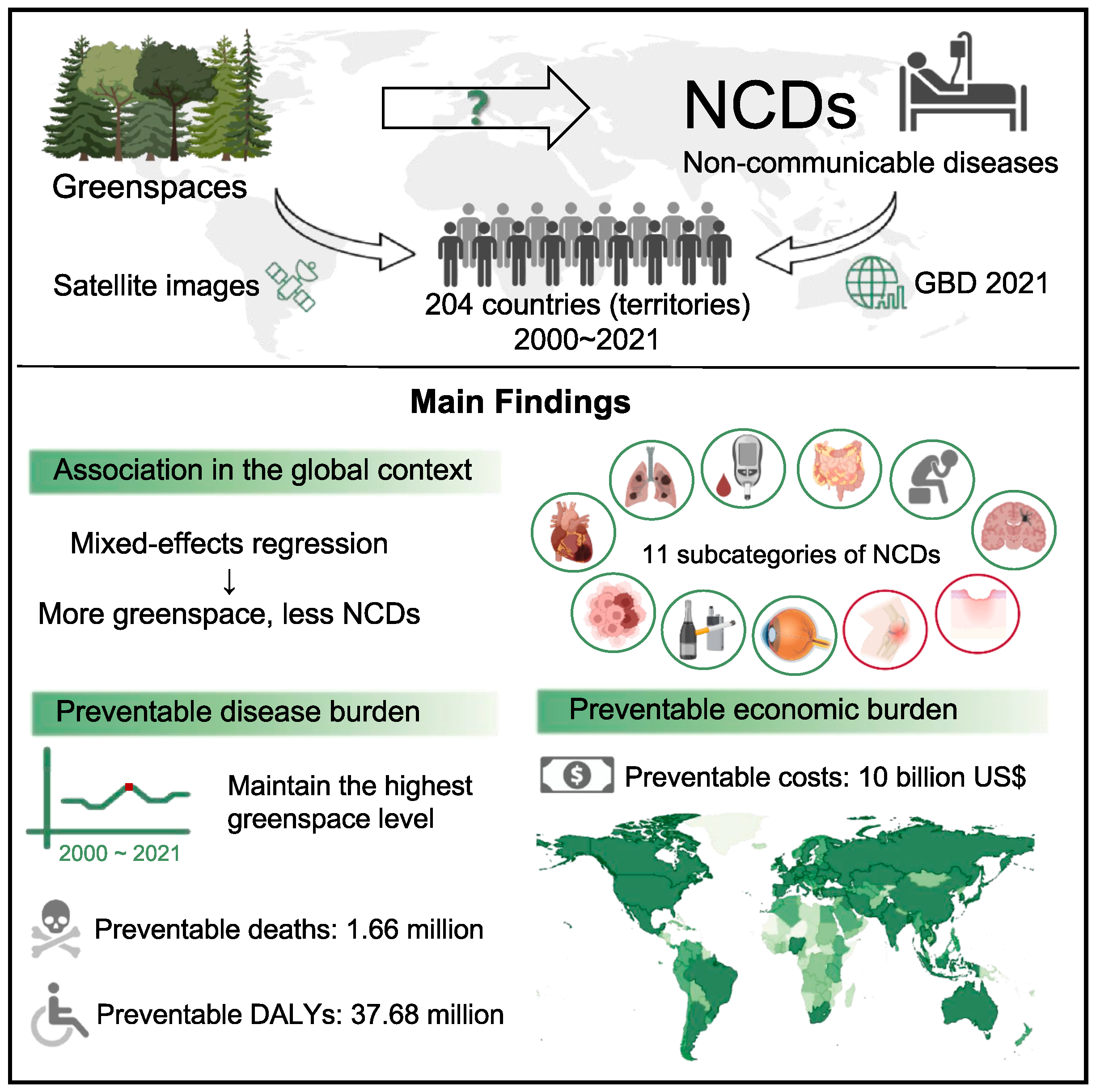 研究团队还在全球尺度上评估绿地水平与慢性非传染性疾病(NCDs)的关联,发现绿地水平与NCDs呈现显著负相关,另外若2000-2021年间各国始终维持其绿地峰值水平,则全球范围可避免166万例NCDs相关死亡,以及避免约100亿美元经济损失,尤其中/高收入地区可获得更高的健康和经济收益。(图2)。该成果近期发表于Cell子刊One Earth(IF=15.3)并获Cell头条报道,博士研究生邱慧玲为第一作者,杨博逸教授为通讯作者。