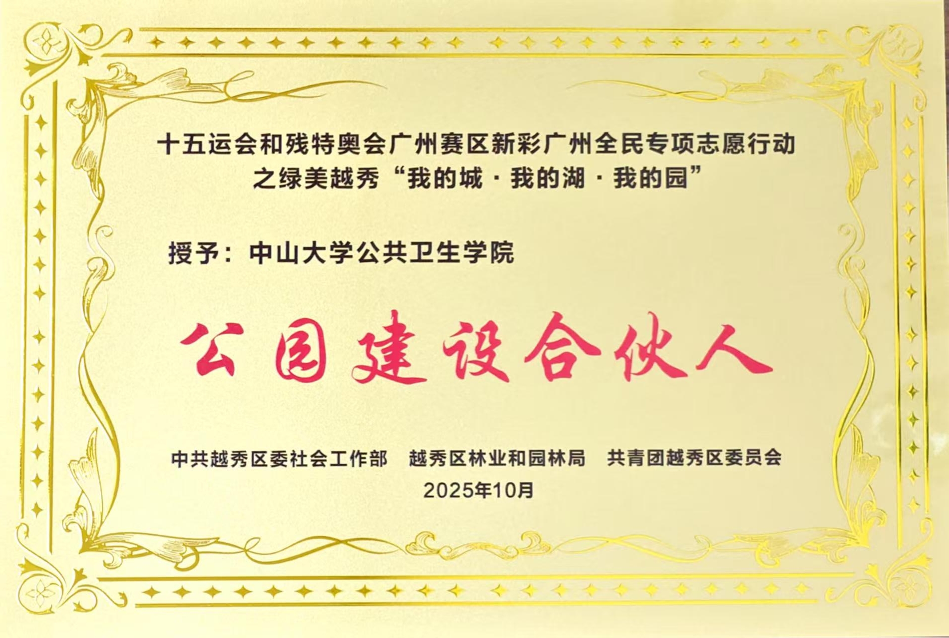 积极响应驻地越秀区团委号召,动员广大学子深入参与“绿美广州”生态建设,引导粤港澳大湾区青年积极参与生态保护,营造全民迎全运、共建绿美越秀的浓厚氛围,被授予“公园建设合伙人”称号。