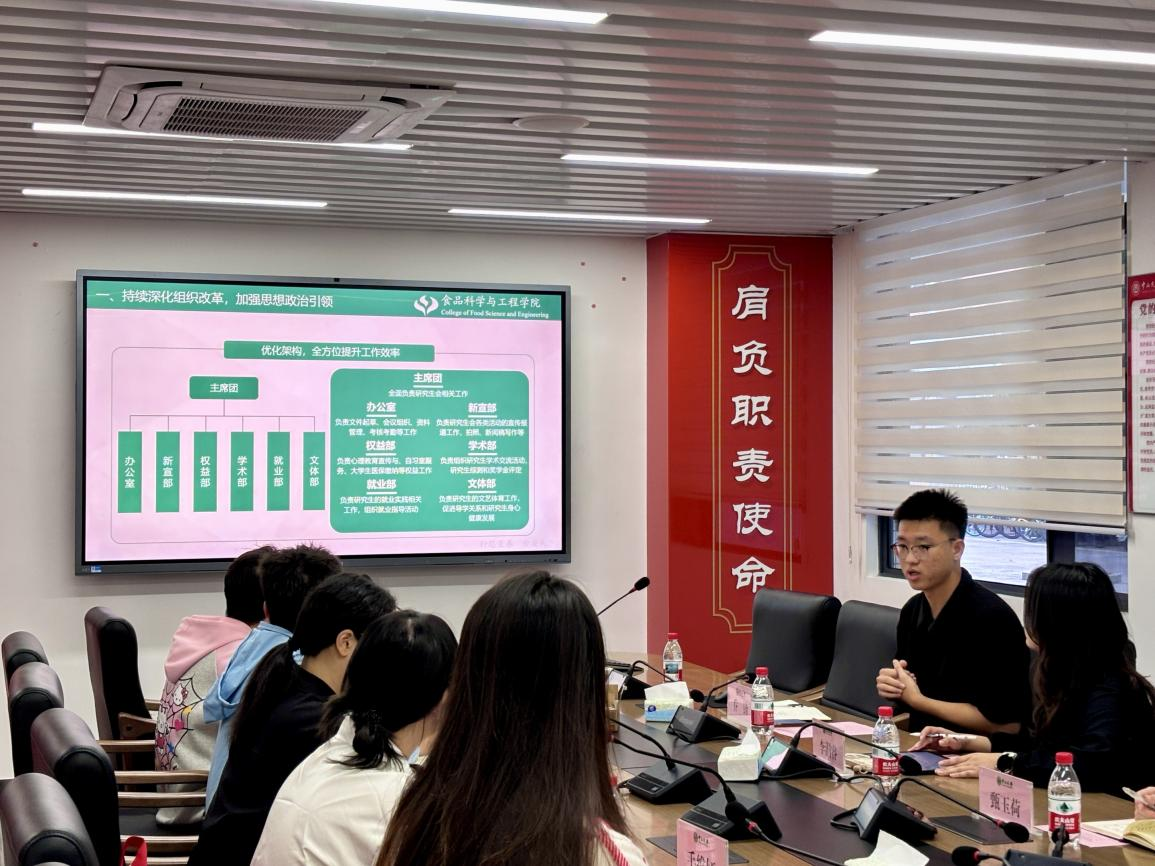 研究生会专题汇报结束后,西北农林科技大学食品科学与工程学院研究生会全面展示了其特色工作与育人成果,涵盖四大板块:在组织改革方面,介绍了研究生会内部架构优化、考核考勤机制完善的具体做法,确保工作高效运转;在校园文化建设方面,分享“一二・九”主题朗诵、实验室安全检查、“宿舍文化绚烂如花”打卡等活动,营造文明和谐的校园氛围;在导学思政方面,重点呈现“榜 young 青年说”朋辈交流平台、导学篮球赛、感恩教师节师生游园会等活动,以多元形式拉近师生距离;在就业服务方面,详解“五个一”就业打卡行动,通过“制作一份简历、熟悉一个岗位需求”等5项具体任务,助力学生明确职业规划。鲜明的专业特色与丰富的实践案例,为后续交流碰撞提供了充足素材。