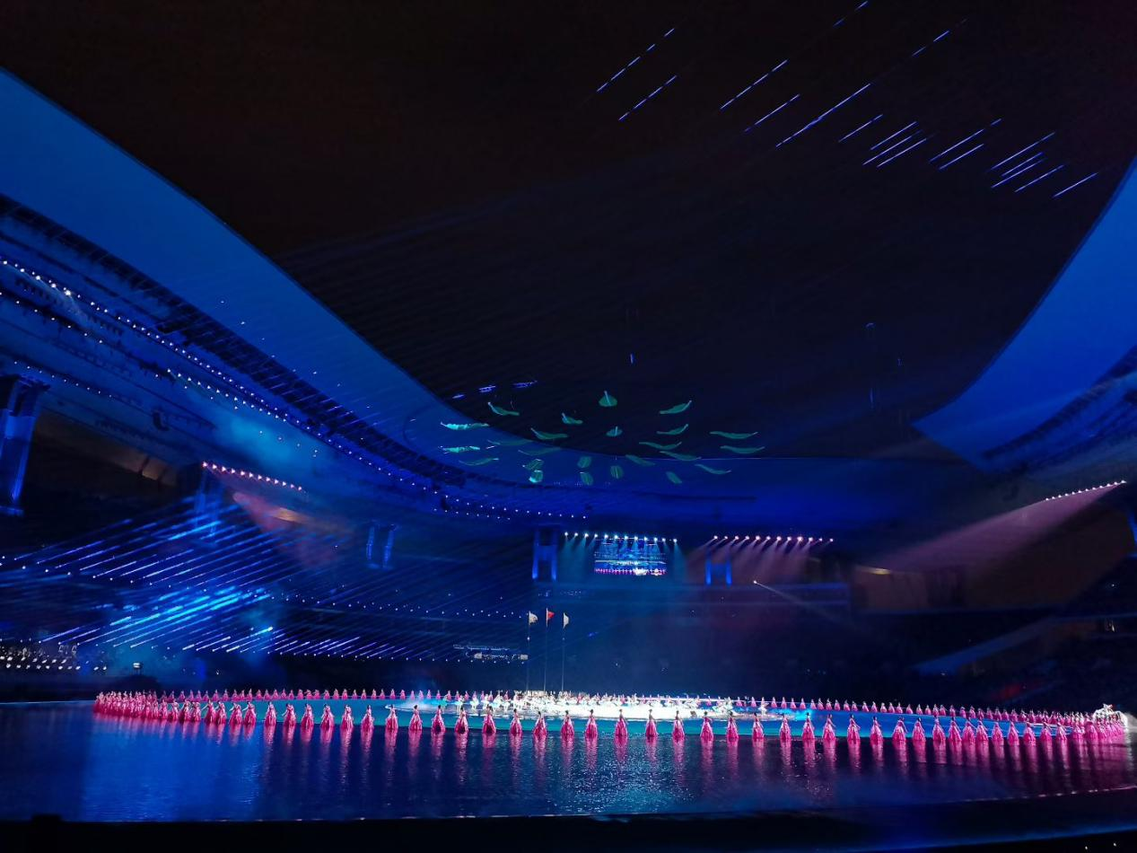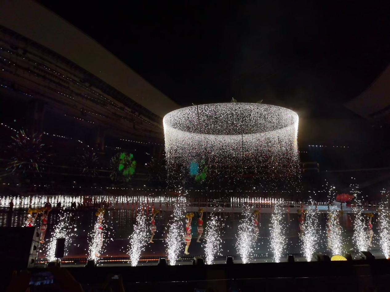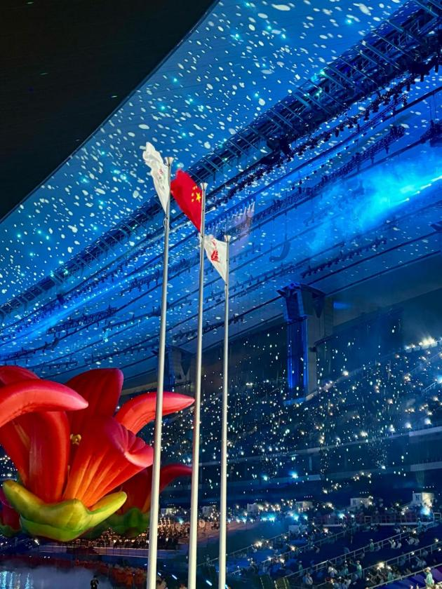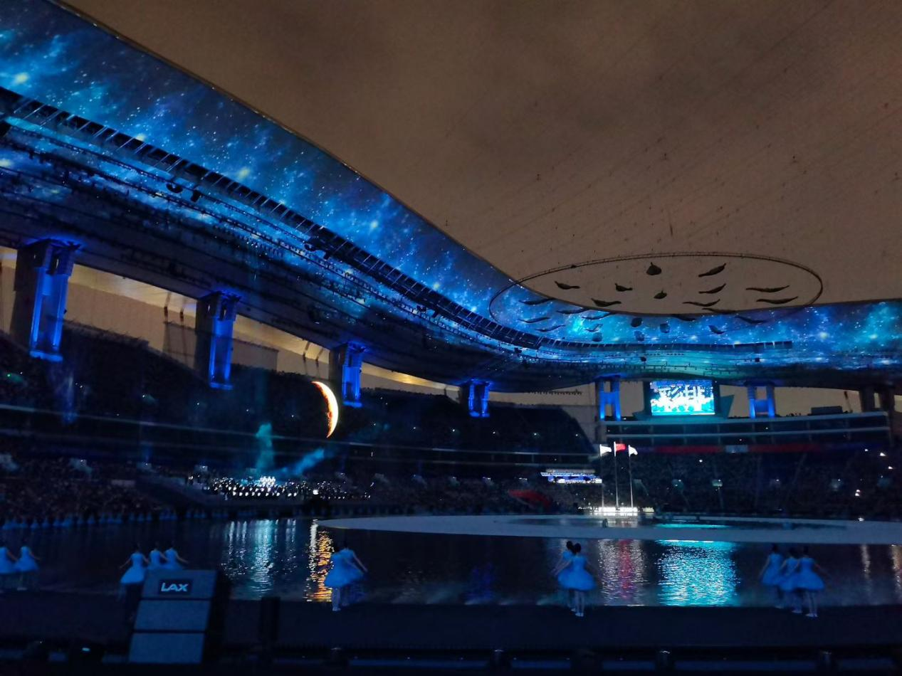 2024级本科生伍伟韬:其实作为中场志愿者,站在北广场是看不到内场舞台的。但还是可以看到奥体的灯光,听到里面播放的音乐。我印象很深刻的一幕是,即将散场欢送时,我们提前上岗。我站在北广场看到奥体中心的顶棚上,蓝色的背景下映着数不胜数的星状光斑。会场内无数闪光灯随音乐节奏摇摆。时值秋夜,明月高悬。那一幕很美,我记得我仰头看了很久很久。