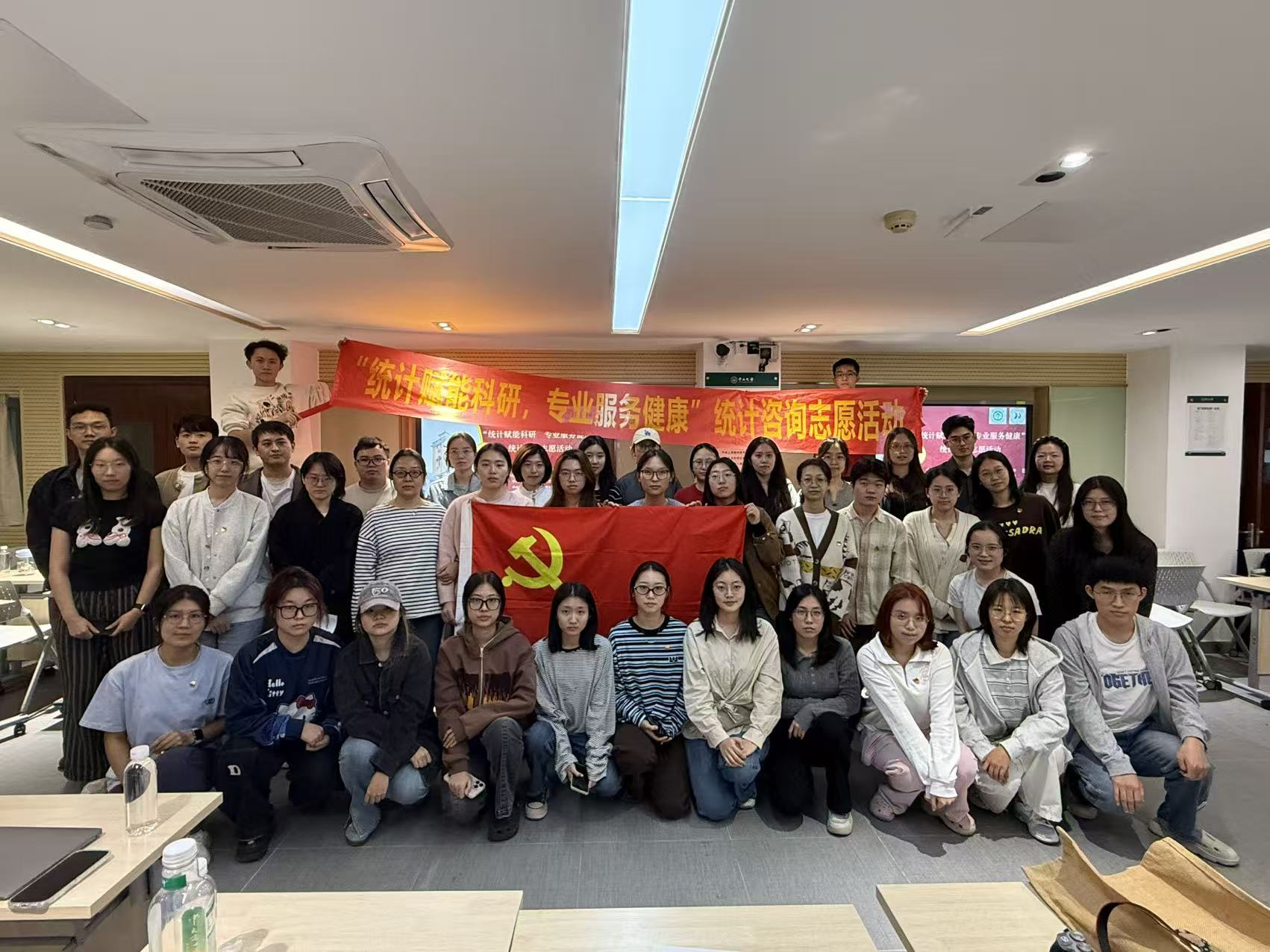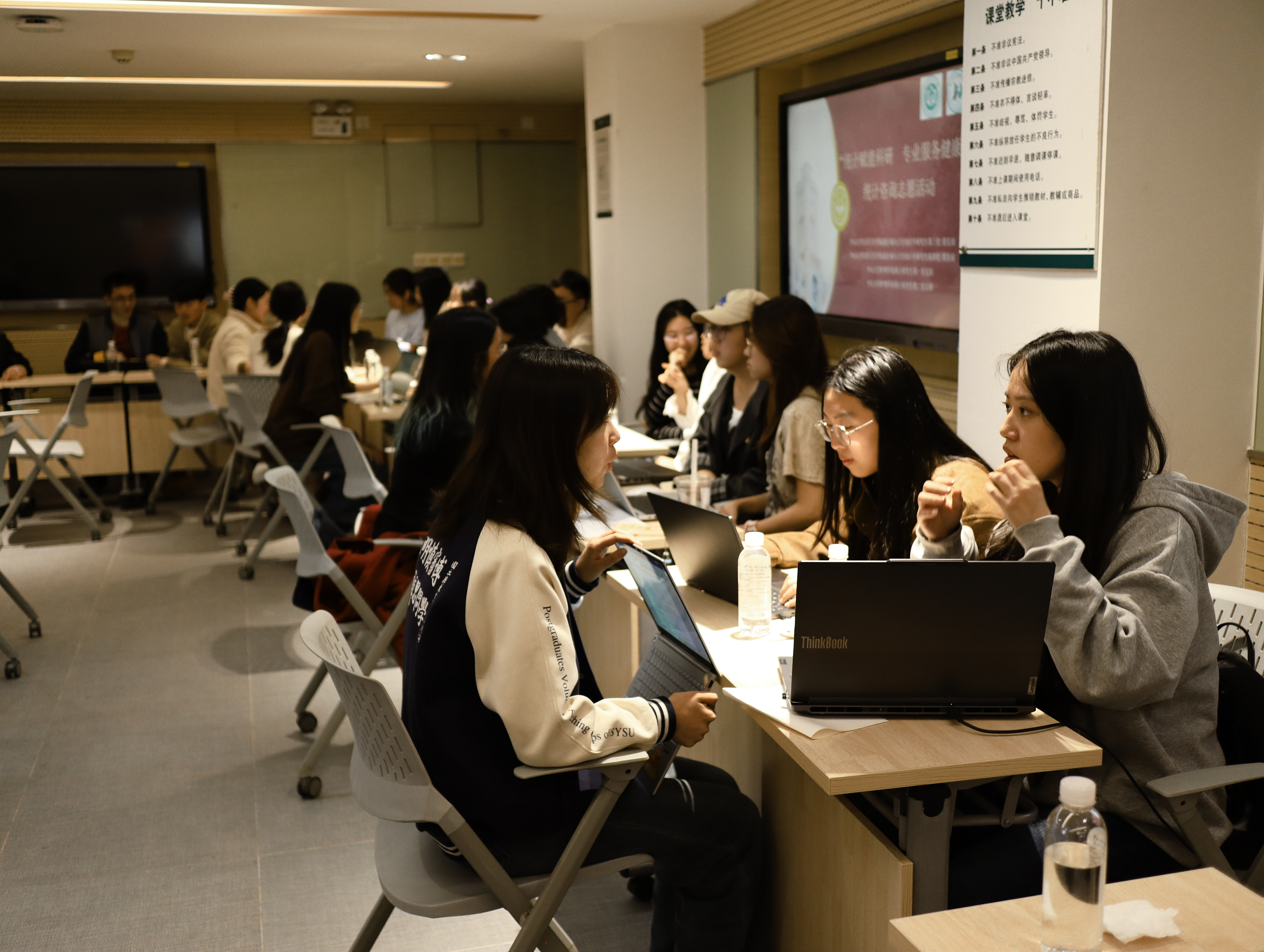党的二十届四中全会强调要“健全基本公共服务体系,提高公共服务水平”,本次主题党日活动正是党员同志们践行全会精神、立足专业岗位服务师生科研与健康事业的生动实践。活动于当晚19点开始。主持人向到场师生介绍了活动背景、目的及主要参与单位,重点说明了咨询流程和志愿者的职责。随后,参与者按编号依次前往咨询台,进行个性化的统计咨询。志愿者团队依据研究方向及年级进行科学分组,以确保咨询服务质量。此外,志愿者们及时更新汇总各咨询台的疑难问题,提交资深志愿者进行统一解答,提供实用的解决方案和学习资源。
