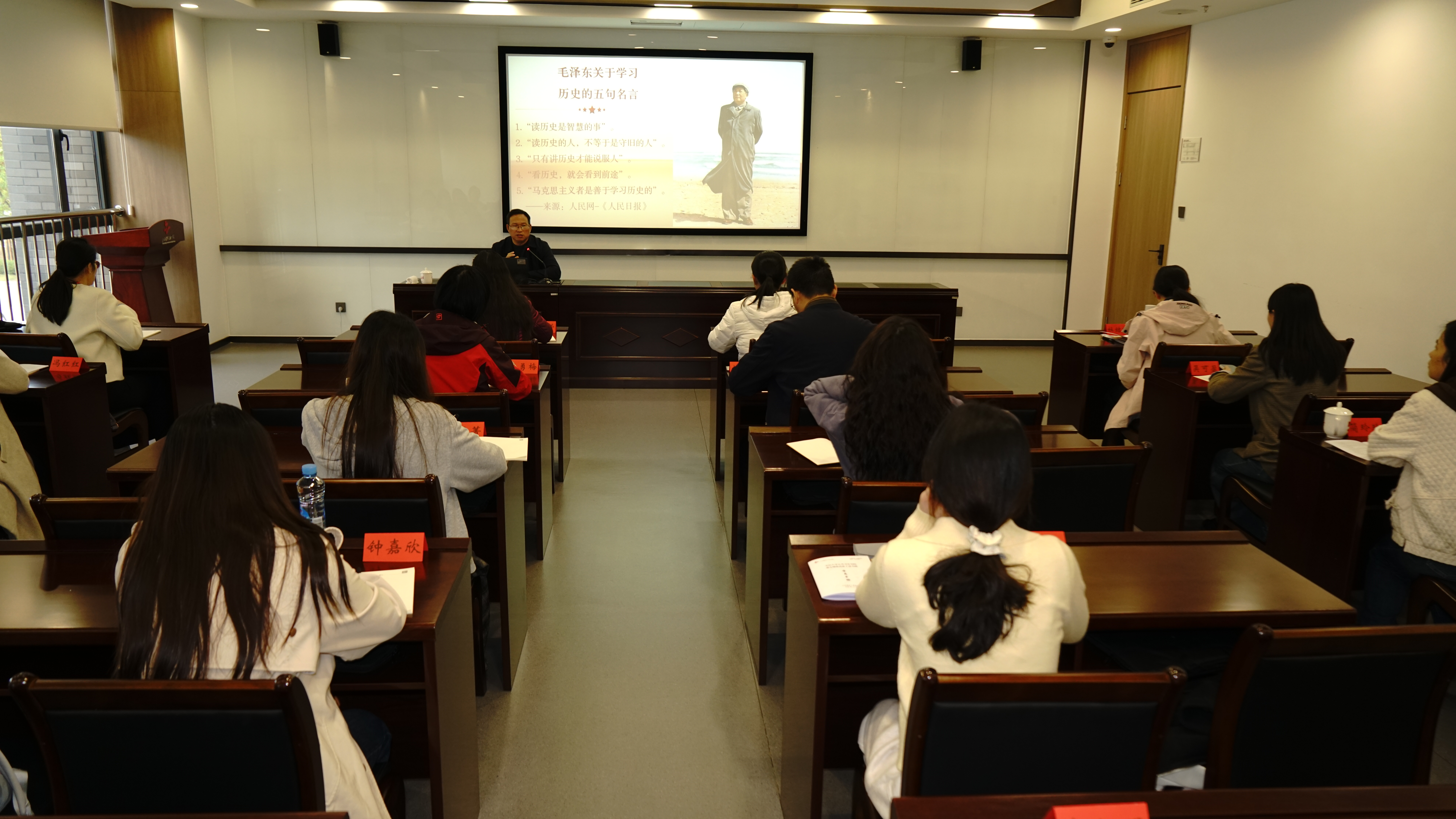 12月5日晚上,周恩来警卫员顾玉平儿子顾蓉生老师以访谈形式讲述周恩来、邓颖超等革命先辈的生平事迹,以珍贵老照片与历史信物直观再现峥嵘岁月。课后学员们围拢顾蓉生夫妇,追问照片背后的革命故事,在沉浸式交流中感悟先辈们的家国情怀。